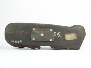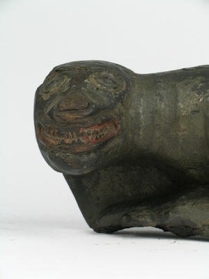 Ziemlich vollrund geschnitzt, rohe Arbeit. Körper grau, Maul rot gefasst.