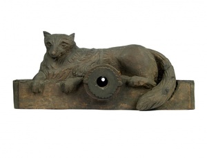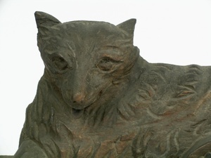 Rechteckiger, niedriger Sockel, an den Seiten mit einfachem Rundstab profiliert. Auf diesem Sockel liegt vollrund geschnitzt, nach links ein Wolf (Spitz ? Fuchs ?), den Kopf frontal gedreht, den buschigen Schwanz über den Sockel gelegt.