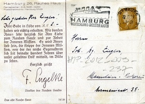 Postkarte vom 22. Oktober 1929 an Johannes Georg Ziegler in Mannheim-Neckarau; Vorderseite: Schwarz-weiß Aufnahme eines Hauses zwischen Bäumen; Rückseite: Briefmarke, Poststempel aus Hamburg, Stempel "Hamburg Deutschlands grösster Hafen", gedruckter Text, der handschriftlich ergänzt wurde: "Hamburg 26, Rauhes Haus / Fernsprecher: D 8, 3481-3483 / Postscheckkonto: Hamburg 5528 / Sehr geehrter Herr Ziegler! Ihre Gabe in Höhe von R.M. 2.- haben wir richtig erhalten. Wir danken Ihnen sehr herzlich für Ihre Liebe zum Rauhen Hause und zur Arbeit in der Inneren Mission. Es wird Ihnen lieb sein, die Krippe der Inneren Mission, von der der reiche Segensstrom sich seit beinahe hundert Jahren über unser geliebtes Volk mitteilt, im Bilde zu sehen. Herzlich grüßt F. Engelke Direktor des Rauhen Hauses / Das alte Rauhe Haus".