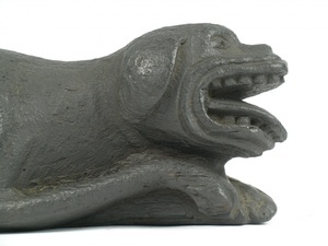 Riegel, Stark Hochrelief. Ein nach rechts springender Hund, auf einem Sockel, den Kopf geradeaus, das Maul offen, die Zunge heraushängend. Mittelscheibe mit Eisenblech.