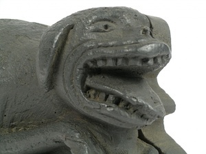 Riegel, Stark Hochrelief. Ein nach rechts springender Hund, auf einem Sockel, den Kopf geradeaus, das Maul offen, die Zunge heraushängend. Mittelscheibe mit Eisenblech.