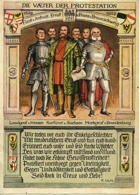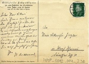 Postkarte vom 19. Juni 1929 an Friedrich Ziegler in Mannheim-Neckarau; Vorderseite: Kolorierte Abbildung zur Erinnerung an die Speyerer Protestation 1529. Abgebildet sind die "Väter der Protestation" der Fürst von Anhalt, Ernst und Franz von Braunschweig, der Landgraf von Hessen, der Kurfürst von Sachsen und der Markgraf von Brandenburg. Der begleitende Text lautet: "Wir treten vor euch ihr Enkelgeschlechter / Mit treudeutschem Gruß und tun euch kund: / Erinnert euch unser und seid starke Wächter / Des, was wir erkämpft mit Hand und Mund. / Haltet hoch die Fahne Gewissensfreiheit! Protestiert unentwegt gegen Uneinigkeit, / Gegen Unduldsamkeit und Gottlosigkeit / Seid stark in Treue und Liebe! / F. Ulm."; Rückseite: Briefmarke, Poststempel aus Speyer, gedruckter Text: "Offizielle Festpostkarte zur 400-Jahrfeier der Protestation vom Jahre 1529 in Speyer vom 19.-21. Mai 1529."