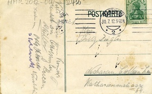 Postkarte vom 30. Juli 1912 an Fritz Ziegler in Mannheim-Neckarau; Vorderseite: Kolorierte Zeichnung von drei aus einem Doppeldecker-Flugzeug fallenden Studenten. Fünf Studenten sitzen noch im Flugzeug. Im Hintergrund ist der Mannheimer Wasserturm zu erkennen. Im Vordergrund befindet sich ein schwarz-weiß-rotes Wappen, auf dem "G.R.G.-U. IIa." steht. Der Titel der Karte lautet "Einjähriges 1912"; Rückseite: Briefmarke, Poststempel aus Mannheim, handschriftliches Grußwort.