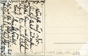 Postkarte zu Pfingsten. Abgebildet ist ein Gemälde von Hannes Petersen mit dem Text: "Ein recht fröhliches Pfingstfest"; Rückseite: handschriftliches Grußwort.