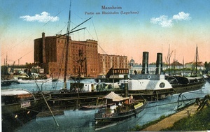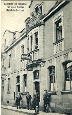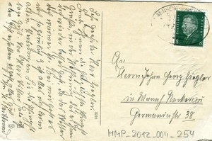 Postkarte vom 6. Juni 1930 an Johann Georg Ziegler in Mannheim-Neckarau; Vorderseite: Kolorierte Abbildung eines Straußes aus Flieder in einer Vase, Beschriftung: "Fröhliche Pfingsten"; Rückseite: Briefmarke, Poststempel aus Mannheim, handschriftliches Grußwort.