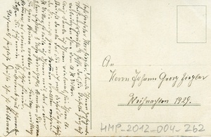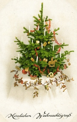 Postkarte zu Weihnachten 1929 an Johann Georg Ziegler; Vorderseite: Kolorierte Abbildung eines geschmückten Weihnachtsbaumes, Beschriftung: "Herzlichen Weihnachtsgruß"; Rückseite: Handschriftliches Grußwort.