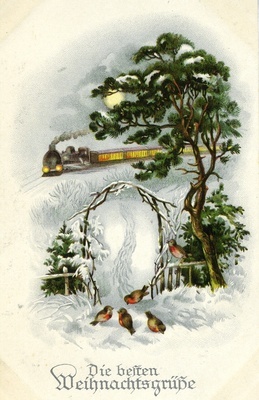 Postkarte an Johann Georg Ziegler vom 22. Dezember 1930; Vorderseite: Kolorierte Abbildung einer winterlichen Idylle mit Rotkehlchen und einem Zug, der durch den Schnee fährt, Beschriftung: "Die besten Weihnachtsgrüße"; Rückseite: Handschriftliches Grußwort.