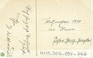 Postkarte zu Weihnachten 1930 an Johann Georg Ziegler; Vorderseite: Kolorierte Darstellung der Erblickung des Sterns zu Bethlehem, Beschriftung: "Gesegnete Weihnachten"; Rückseite: Handschriftliches Grußwort.