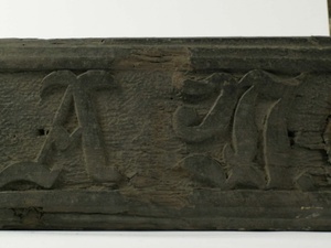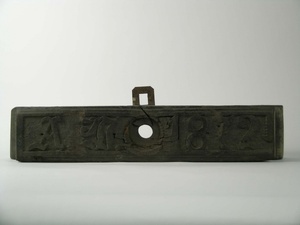 Rechteckiger Riegel, leicht konkav gewölbt. An den Schmalseiten mit tiefem Sima abgeschlossen, mit schmalem Profil umrandet. Gerades Schriftschild: A W (Mittelscheibe) 1872, erhaben, gekörnter Grund. Seitlich Einziehung.