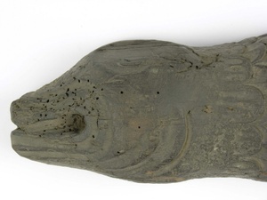 Riegel, stark plastisch. Fisch mit dickem Kopf und umgeschlagenem Schwanz. Birnenförmiger Kopf, glatt. Körper mit breiten Schuppen.