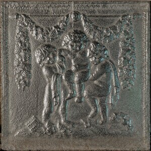 Putten-Fassriegel. Über dem zapfenförmigen Ausschnitt für die Schraube steht ein Blumenkorb, von welchem nach beiden Seiten Blütenranken ausgehen. Diese Ranken werden von zwei Putten, die auf den Riegelseiten unter einem Baume sitzen, gehalten. Hügelartiger Grund mit Bäumen.