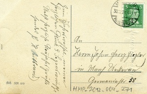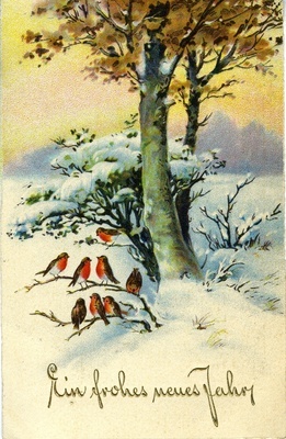 Postkarte vom 30. Dezember 1928 an Johann Georg Ziegler in Mannheim-Neckarau; Vorderseite: Kolorierte Abbildung von Bäumen und Sträuchern im Schnee, auf deren Zweigen Rotkehlchen sitzen, Beschriftung: "Ein frohes neues Jahr"; Rückseite: Briefmarke, Poststempel aus Mannheim-Rheinau, handschriftliches Grußwort.