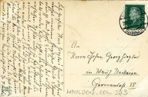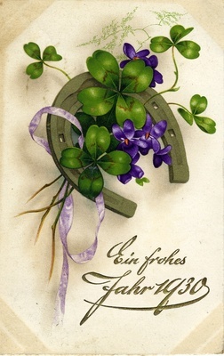 Postkarte vom 28. Dezember 1929 an Johann Georg Ziegler in Mannheim-Neckarau; Vorderseite: Kolorierte Abbildung von einem Hufeisen, Veilchen und vierblättrigen Kleeblättern, Beschriftung: "Ein frohes Jahr 1930"; Rückseite: Briefmarke, Poststempel aus Mannheim-Rheinau, handschriftliches Grußwort.