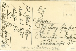 Postkarte an Johann Georg Ziegler in Mannheim-Neckarau; Vorderseite: Kolorierte Abbildung eines Tannenzweiges mit Zapfen, zusammengehalten von einem Mistelzweig, Beschriftung: "Glückliches Neujahr"; Rückseite: Handschriftliches Grußwort.