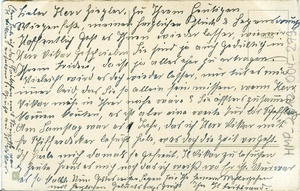 Geburtstagskarte, auf der ein Rosenzweig abgebildet ist sowie der Text: "Ich habe dich je und je geliebt; darum habe Ich dich zu Dir gezogen aus lauter Güte. Jes. 13,3. / Herzlichen Glückwunsch zum Geburtstage". Auf der Rückseite befindet sich das handschriftliche Grußwort.