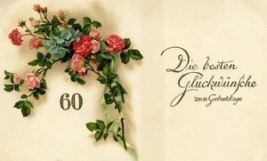 Geburtstagskarte, auf der ein Blumenstrauß abgebildet ist. Die Beschriftung lautet: "Die besten Glückwünsche zum Geburtstage". Ein kurzes persönliches Grußwort befindet sich auf der Rückseite.