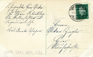 Geburtstagskarte vom 9. Oktober 1929 an Friedrich Ziegler; Vorderseite: Kolorierte Abbildung eines Rosenstraußes mit der Beschriftung: "Herzliche Geburtstagswünsche"; Rückseite: Briefmarke, Poststempel aus Mannheim-Rheinau, handschriftliches Grußwort.