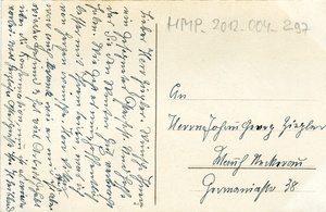 Postkarte an Johann Georg Ziegler in Mannheim-Neckarau; Vorderseite: Kolorierte Abbildung eines Blumenstraußes mit der Beschriftung: "Gesegnete Ostern! / Ich weiß, daß mein Erlöser lebt! Hiob 19,25."; Rückseite: Handschriftliches Grußwort.