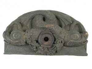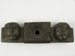 Vollrunder Löwenkopf (geziert). An den Schmalseiten mit je einer G-förmigen, geschwungenen Akanthusranke geziert.