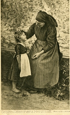 Die ungelaufene und unbeschriebene Postkarte zeigt eine schwarz-weiß Aufnahme von einem Mädchen und einer Frau auf einer Wiese mit der Beschriftung: "Muttis Liebling."; Rückseite: Aufdruck: "Wohlfahrts-Karte / Deutscher Nachwuchs / Deutschlands Zukunft / Deutscher Verein für Säuglingsfürsorge 1916, e.v. / 1. Vorsitzende: Frau Baronin Anna von Strantz-Führing / Motto: Wir beugen uns vor Gott, weil / Er so groß ist, / Und vor dem Kinde, weil / Es so klein ist."