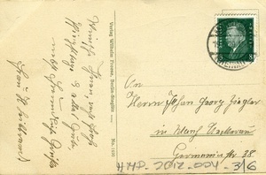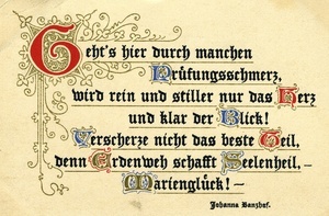 Postkarte vom 19. Mai 1929 an Johann Georg Ziegler in Mannheim-Neckarau; Vorderseite: Text: "Geht’s hier durch manchen Prüfungsschmerz, wird rein und stiller nur das Herz und klar der Blick! Verscherze nicht das beste Teil denn Erdenweh schafft Seelenheil, - Marienglück! - Johanna Banzhaf."; Rückseite: Briefmarke, Poststempel aus Mannheim-Rheinau, handschriftliches Grußwort.