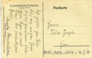 Postkarte an Herrn Ziegler; Vorderseite: Schwarz-weiß Zeichnung einer Bibelszene mit der Beschriftung: "Also spricht Christus, unser Herr: / ’Kinder, ich liebe euch von ganzem Herzen, ’rmste, ich pflege euch in euern Schmerzen, Sünder, ich trage euch mit eurer Schuld, Büßer, ich vergebe euch in großer Schuld, Verstockte, ich strafe euch mit harten Hieben, Verirrte, ich locke euch in treuem Lieben, Jünger, ich sende euch hinein in die Welt, Überwinder, ich begrüße euch überm Sternenzelt!’ F. H."; Rückseite: Aufdruck: "Evangelisations-Postkarten 1. Serie Nr. 4", handschriftliches Grußwort.
