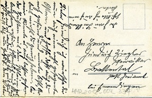 Postkarte an Friedrich Ziegler in Brettental; Vorderseite: Kolorierte Abbildung einer Frühlingslandschaft mit Birken (oval ausgeschnitten) und eines Straußes Weidenkätzchen mit Beschriftung: "Herzliche Ostergrüße"; Rückseite: Handschriftliches Grußwort.
