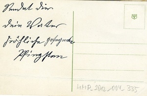Die ungelaufene Postkarte zeigt einen Strauß von zwei Rosen und Maiglöckchen mit der Beschriftung "Herzlichen Pfingstgruß". Die Rückseite ist handschriftlich beschrieben.