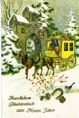 Postkarte an Friedrich Ziegler in Brettental; Vorderseite: Kolorierte und mit goldener Farbe verzierte Abbildung Kutsche vor einem Torbogen, ein goldenes Hufeisen und Kleeblätter sind im Vordergrund zu sehen, Beschriftung: "Herzlichen Glückwunsch zum Neuen Jahre"; Rückseite: Handschriftliches Grußwort.