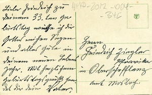 Postkarte an Friedrich Ziegler in Oberschefflenz; Vorderseite: Kolorierte Abbildung eines Straußes aus Rosen und Maiglöckchen, Beschriftung: "Herzlichen Glückwunsch zum Geburtstage"; Rückseite: Handschriftliches Grußwort.