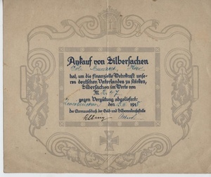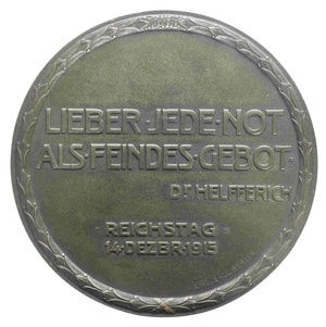 Die Vorderseite der Medaille zeigt im Vollprofil Dr. Karl Helfferich, Staatssekretär im Reichsschatzamt, der maßgeblich für die Kriegsfinanzierung des Deutschen Reiches durch Anleihen verantwortlich war. Unten links "Fr. Eue". Auf der ringsum durch einen Lorbeerkranz eingefassten Rückseite "Lieber jede Not als Feindes Gebot / Dr. Helfferich". Darunter "Reichstag 14. Dezember 1915". Wiederum darunter am unteren rechten Rand " Verl. Ball Berlin".