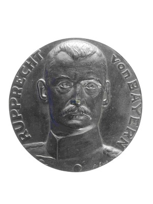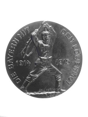 Die Vorderseite der Medaille zeigt Kronprinz Rupprecht von Bayern im Dreiviertelprofil. Links/rechts daneben "Rupprecht/von Bayern". Darunter "Fr. Eue". Die Rückseite zeigt einen deutschen Soldaten mit Pickelhaube im Ausfallschritt. Über dem Kopf hält er mit beiden Händen sein Gewehr, mit dessen Kolben er zum Schlag ansetzt. Am Medaillenrand links/rechts daneben "Die Bayern mit/dem Löwenmut". Links/rechts im Raum zwischen Hüfte und Schrift am Rand "1914/1915", darunter "Ball, Berlin".