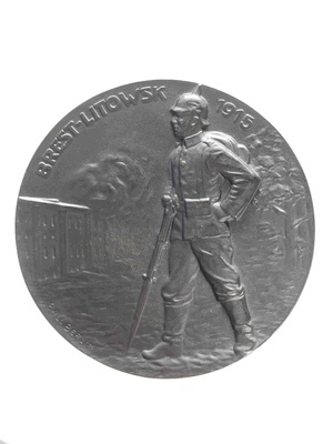 Die Vorderseite der Medaille zeigt General v. Mackensen in Frontalansicht. Am rechten Münzrand ist ein stilisierter Lorbeerzweig über der Schulter des Generals dargestellt. Am linken Bildrand "v. Mackensen". Am rechten unteren Rand der Vorderseite "Fr. Eue". Die Rückseite zeigt einen deutschen Soldaten mit Pickelhaube, Tornister und Gewehr vor dem Hintergrund brennender Gebäude und einer Baumgruppe. Darüber "Brest-Litowsk 1915". Darunter "Ball Berlin". Beide Reliefs treten merklich plastisch hervor.
