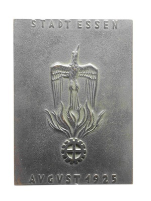 Die hoch-rechteckige Medaille zeigt auf der Vorderseite einen Stahlarbeiter mit Hammer, Schürze und freiem Oberkörper zwischen stilisierten Industrieanlagen mit Schornstein. Am oberen/unteren Rand "Die Befreiung/Der Ruhr". Auf der Rückseite ist ein Phoenix dargestellt, der aus Flammen hervorsteigt, welche wiederum einem stilisierten Zahnrad entspringen. Darüber/darunter "Stadt Essen/August 1925".