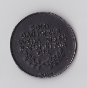Erinnerungsmedaille ausgegeben von den Goldsammelstellen des Deutschen Reiches während des Ersten Weltkrieges. Auf der Vorderseite befindet sich das Flache Relief einer knienden Frauenfigur mit Waage in der ausgestreckten Hand im Vollprofil. Darüber "In eiserner Zeit". Darunter "1916". Auf der Rückseite "Gold gab ich zur Wehr Eisen nahm ich zur Ehr". Darunter stilisiertes Eichenlaub und "Hosaeus". Die Erinnerungsmedaille erhielt Frau Barbara Bender (geb. Fischer, *1881) für ihren bei einer Goldsammelstelle abgelieferten goldenen Ehering im Jahr 1916.