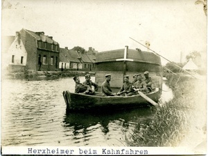 Die Aufnahme zeigt sieben Soldaten in einem Kahn. Der Kahn liegt auf einem Kanal, wohlmöglich an der Westfront in Belgien/Flandern. Im Bug des Kahns liegt der Soldat/Unteroffizier Otto Deutsch aus Herxheim. Am unteren Bildrand befindet sich die maschinenschriftliche Notiz "Herxheimer beim Kahnfahren".