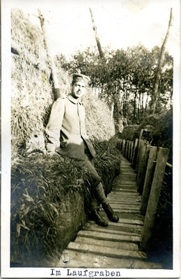 Die Aufnahme zeigt den Soldaten Otto Deutsch aus Herxheim bei Ladau (Pfalz) in einem Laufgraben an der Westfront, wahrscheinlich in Belgien/Flandern. Möglicherweise handelt es sich aber auch um einen Laufgraben auf einem Truppenübungsplatz. Unter dem Bild im Hochformat befindet sich die maschinenschriftlich verfasste Bildunterschrift "Im Laufgraben". Auf der Rückseite befindet sich die handschriftlich und mit schwarzem Kugelschreiber verfasste Notiz "Otto Deutsch".