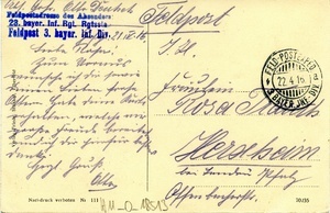 Die Postkarte zeigt auf der Vorderseite den Druck einer Aufnahme des Ehrenfriedhofs bei Illies in Nordfrankreich. Illies liegt bei Lille unweit der Grenze zu Belgien. Auf der Rückseite befindet sich eine handschriftlich mit Bleistift verfasste Nachricht von Otto Deutsch an Rosa Trauth in Herxheim bei Landau (Pfalz) vom 21.04.1916.