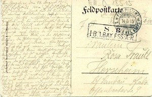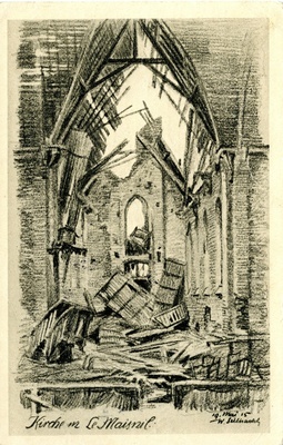 Die Feldpostkarte zeigt auf der Vorderseite den Druck einer Kohlezeichnung der zerstörten Kirche von Le Maisnil. Auf der Rückseite befindet sich die handschriftlich und mit Bleistift verfasste Nachricht des Unteroffiziers Trauth an Rosa Trauth in Herxheim bei Landau (Pfalz), Offenbacherstraße 9.