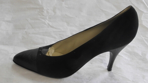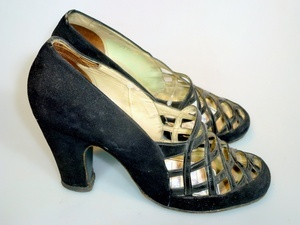 Ein Paar Damensandaletten aus weißem Leder. Runde Form, lederbezogener und genagelter Pfennigabsatz (ca. 9cm). Ein sehr feiner Knöchelriemen mit Schnalle dient dem Verschluss. Jeweils elf sehr feine, einzeln verbundene Riemen bilden ein verschlungenes Muster am Zehenteil, jeweils zwei der Riemen ziehen sich über den gesamten Schuh und gehen in den Knöchelriemen über. Abgesehen von den genannten Riemen sind die Schuhe komplett offen. Alle Riemen zeigen sehr feine sichtbare Nähte. Die Innensohle aus cremefarbenem Leder ist mit einem Muster am Rand und einer Zierlochung versehen. Hergestellt von der Firma Diamant in Berlin, Damengröße 5,5.