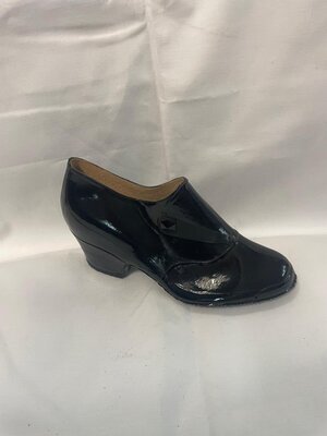 Ein Paar Damenschuhe aus schwarzem Gummi. Runde Form, etwa knöchelhoch, gummibezogener Absatz (ca. 6,5cm). Eine große Lasche mit Druckknopf dient dem Verschluss. Die Ränder von dieser und dem Einstieg sind in einem Rillenmuster geprägt. Die Kappe ist zusätzlich mit Gummi verstärkt. Der Gummibezug des Absatzes überlappt mit dem Obermaterial, wodurch der Absatz fast mit dem restlichen Schuh verschmilzt.