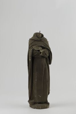 Bei dem aus Nussbaumholz geschnitzten und mit Silbermontierungen versehenen ’Hottenmann’ (andernorts ’Buttenmann’ oder ’Buttenmännchen’ genannt) handelt es sich um einen in der ausgehenden Renaissance im südwestdeutschen Raum häufiger belegten Tafelschmuck. Dargestellt ist ein Mann in zeitgenössischer Kleidung des sechzehnten Jahrhunderts, mit hochgeschlossenem Wams und angesetztem Faltrock, darunter kurzen, gebauschten Pluderhosen; an den Beinen sind Kniestrümpfe angedeutet. Der Mann trägt einen hohen Hut mit einfacher Krempe und Federschmuck. In den Händen hält er ein Brot und ein hohes Stangenglas mit Nuppen. Zu Füßen der Hauptfigur finden sich zwei miniaturisierte Heiligenfiguren: vorne der Hl.Georg, der den Drachen besiegt, auf der Rückseite eine kniende Frau mit Krone, vielleicht als Hl. Agnes zu deuten. Der Widder neben ihr könnte als passendes Attribut dieser Heiligen aufgefaßt werden. Auf dem Rücken trägt die Hauptfigur eine Hotte, das traditionelle Rückentragegefäß, in dem die Trauben aus dem Weinberg transportiert werden. Hier dient die Hotte als Trinkgefäß. Das Trinken dürfte einigermaßen unpraktisch gewesen sein; freilich muß man berücksichtigen, daß bei diesen Schmuckgefäßen der Schauwert über dem funktionalen Aspekt stand. Die Hotte, die Figur, die Heiligen und der Fuß der Holzskulptur sind mit gravierten und getriebenen Silbermontierungen verziert. Auf der Unterseite des Sockels ist das Beschauzeichen der Frankfurter Silberschmiede und das Meisterzeichen PN (=Peter Noblett) eingeschlagen. (Ludger Tekampe) ACHTUNG KUNSTDIEBSTAHL: Das Exponat wurde aus einer Vitrine im Weinmuseum des Historischen Museums der Pfalz gestohlen. Hinweise auf den Verbleib des Objektes nimmt das Historische Museum der Pfalz (06232 13250, info(at)museum.speyer.de) und die Polizeidienststelle Speyer (06232 1370, pispeyer.kriminaldienst(at)polizei.rlp.de) entgegen. (04/2018)