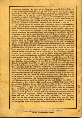 Die Zeitschrift "Der Weltkrieg 1914". Heft 9 mit S. 257-288, Preis: 25 Pfg. Auf der ersten Umschlagseite ist die Zeichnung einer Kriegsszene abgebildet, auf den restlichen geht es um einen Kriegsbericht des deutsch-französischen Krieges 1870/71. Inhaltlich werden der Kriegsschauplatz in den Vogesen und die deutsch-russische Front in Ostpreußen thematisiert, welche durch Fotografien und Zeichnungen veranschaulicht werden. Anbei ist ein Poster mit dem Titel "Die Flucht der Russen nach der Schlacht bei Tannenberg."