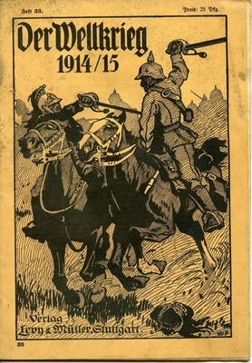 Die Zeitschrift "Der Weltkrieg 1914/15". Heft 23 mit S. 705-736, Preis: 25 Pfg. Auf der ersten Umschlagseite sind zwei sich bekämpfende Soldaten auf Pferden abgebildet, auf den restlichen ist die Erzählung von Fritz Red-Malleczewen über den Seekrieg 1914/15 abgedruckt. Auf S.705 ist ein Foto von Soldaten, die feindliche Flieger beobachten. Inhaltlich geht es um den Stellungskampf an der Aisne und den Schützengabenkrieg, welche durch Fotografien und Zeichnungen veranschaulicht werden.
