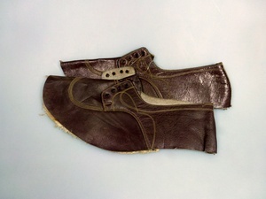 Zwei einzelne Stiefelgamaschen aus schwarzem Leder. Ein Riemen mit Schnalle, welcher sich am Einstieg befindet, dient der Befestigung. Die Gamaschen weisen sichtbare Nähte an den äußeren Rändern auf und haben etwa die Länge eines Schienbeins. Gamaschen dieser Art wurden genutzt um Stiefel vor Umwelteinflüssen, Schmutz und Abnutzung zu schützen, wahrscheinlich wurden sie auch als Reitstiefel genutzt. Datiert auf etwa 1930-1934. Eine der Gamaschen wurde nachweislich von einem Mitglied der rechtsradikalen Organisation "Stahlhelm" getragen.