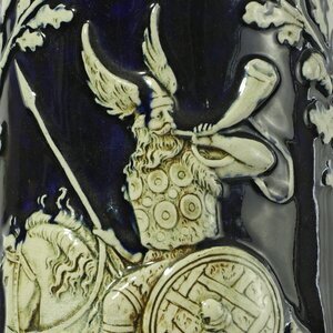 Bei dem Bierkrug handelt es sich um ein industriell gefertigtes Produkt, welches in hoher Stückzahl als Touristenware gefertigt wurde. Auf der Vorderseite die Darstellung eines germanischen Reiters, der mit einem Speer bewaffet und in Begleidung eines Hundes auf der Jagt ist. Das Bild ist mit Eichenranken in einem 230 mm Kreis eingefaßt. Auf der Rückseite (hinter als Holzast geformtem Griff) sinzen zwei germanische Kriegen vor einen Faß und trinken aus Bechern. Der linke Krieger hat ein Horn umgehangen und neben seinem Sitz liegt eine Keule. Über den Bildern bildet dünne erhabene Ringe mit eingefaßten Eichen-Blüten-Ranken den Abschluß. Auf der linken Seite steht der Text: "Hier wohnen die alten Deutschen / an beiden Ufern des Rheins" Auf der rechten Seite steht der Text: "Sie lagen auf Bärenhäuten / und tranken imer(über m einen Strich) noch eins" Auf dem Boden befinden sich die Prägungen: "1G15", "3 L" und "Germany"