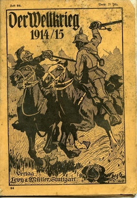 Die Zeitschrift "Der Weltkrieg 1914/15". Heft 27 mit S. 833-864, Preis: 25 Pfg. Auf der ersten Umschlagseite sind zwei sich bekämpfende Soldaten auf Pferden abgebildet, auf den restlichen ist die Erzählung von Fritz Red-Malleczewen über den Seekrieg 1914/15 abgedruckt. Inhaltlich werden der östliche Kriegschauplatz, der englisch-deutsche Handelskrieg und der Kreuzerkrieg thematisiert, welche durch Fotografien und Zeichnungen veranschaulicht werden. Anbei ist das Poster mit dem Titel "Wegnahme russischer Geschütze durch ungarische Husaren."
