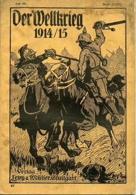 Die Zeitschrift "Der Weltkrieg 1914/15". Heft 27 mit S. 833-864, Preis: 25 Pfg. Auf der ersten Umschlagseite sind zwei sich bekämpfende Soldaten auf Pferden abgebildet, auf den restlichen ist die Erzählung von Fritz Red-Malleczewen über den Seekrieg 1914/15 abgedruckt. Inhaltlich werden der östliche Kriegschauplatz, der englisch-deutsche Handelskrieg und der Kreuzerkrieg thematisiert, welche durch Fotografien und Zeichnungen veranschaulicht werden. Anbei ist das Poster mit dem Titel "Wegnahme russischer Geschütze durch ungarische Husaren."