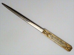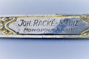 Es handelt sich um einen länglichen Brieföffner mit flacher Klinge. Auf dem Griff ist mittig die Gravierung JOH. RACKÉ-MAINZ in der ersten Zeile, darunter MONOPOL-SPRIT angebracht. Die Firma Johann Racké, Spirituosen-, Essig und Senffabrik wurde 1845 gegründet. Im 19. und 20. Jahrhundert hatten mehrere bedeutende Essig- und Senffabrikanten ihren Sitz in Mainz. So auch die alteingesessene Mainzer Familie Racké, die sich überdies dem Weinhandel und der Branntweinfabrikation widmete. Bei dem Brieföffner handelt es sich wahrscheinlich um ein Werbegeschenk.
