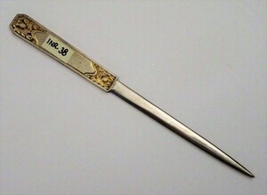Es handelt sich um einen länglichen Brieföffner mit flacher Klinge. Auf dem Griff ist mittig die Gravierung JOH. RACKÉ-MAINZ in der ersten Zeile, darunter MONOPOL-SPRIT angebracht. Die Firma Johann Racké, Spirituosen-, Essig und Senffabrik wurde 1845 gegründet. Im 19. und 20. Jahrhundert hatten mehrere bedeutende Essig- und Senffabrikanten ihren Sitz in Mainz. So auch die alteingesessene Mainzer Familie Racké, die sich überdies dem Weinhandel und der Branntweinfabrikation widmete. Bei dem Brieföffner handelt es sich wahrscheinlich um ein Werbegeschenk.